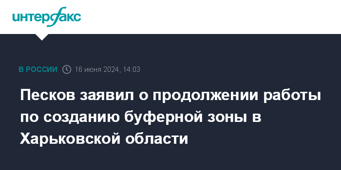 Москва. 16 июня. INTERFAX.RU - Россия продолжит работу по созданию буферной зоны в Харьковской области, пока не обезопасит Белгородскую область и другие регионы, заявил пресс-секретарь президента РФ Дмитрий Песков.