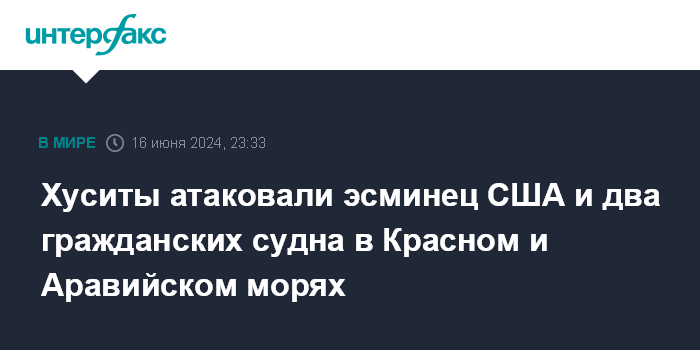 Москва. 16 июня. INTERFAX.RU - Йеменские хуситы заявили в воскресенье, что обстреляли американский эсминец и два судна в Красном и Аравийском морях, сообщают западные СМИ.