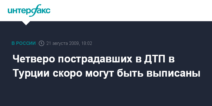 Санкт-Петербург. 21 августа. INTERFAX.RU - Состояние четверых пострадавших в ДТП в Турции петербуржцев оценивается как хорошее, они могут быть выписаны в ближайшее время, говорится в сообщении на сайте турфирмы, отправившей их на отдых.