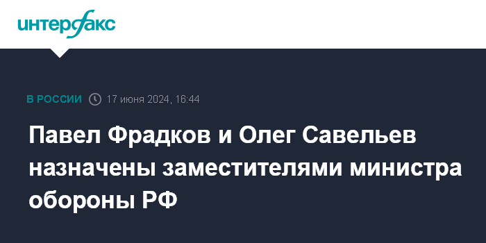 Москва. 17 июня. INTERFAX.RU - Президент РФ Владимир Путин назначил Олега Савельева и Павла Фрадкова заместителями министра обороны.