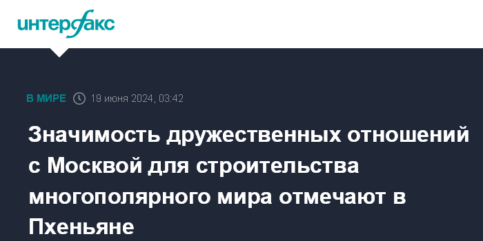 Москва. 19 июня. INTERFAX.RU - Отношения дружбы и сотрудничества России и КНДР важны для защиты мира и безопасности, строительства многополярного мира, подчеркивает Центральное телеграфное агентство Кореи (ЦТАК) на фоне государственного визита президента РФ Владимира Путина в Пхеньян.