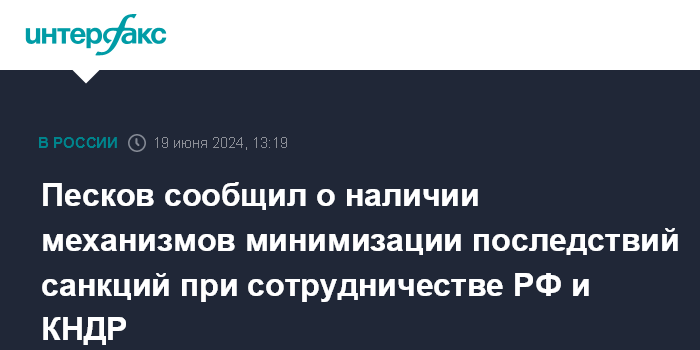 Москва. 19 июня. INTERFAX.RU - В Кремле, комментируя сотрудничество РФ и КНДР в условиях санкций ООН, заявили, что существуют механизмы суверенизации, которые могут минимизировать негативные последствия незаконных ограничений в отношении двух стран.