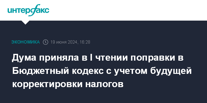 Москва. 19 июня. INTERFAX.RU - Госдума на заседании в среду приняла в первом чтении поправки в Бюджетный кодекс (БК), которые учитывают ожидаемые с 2025 года налоговые изменения в части НДФЛ, налога на прибыль и рентных налогов.