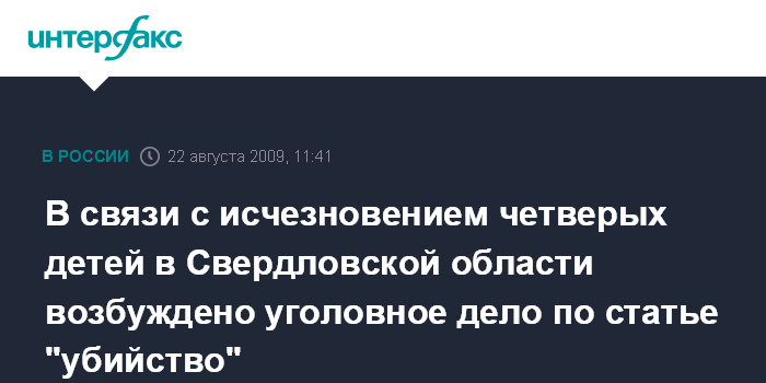Как сообщил агентству "Интерфакс-Урал" руководитель пресс-службы ГУВД Свердловской области Валерий Горелых, в связи с пропажей детей возбуждено уголовное дело по ч.2 п. "а" ст. 105 УК РФ (убийство двух и более лиц).