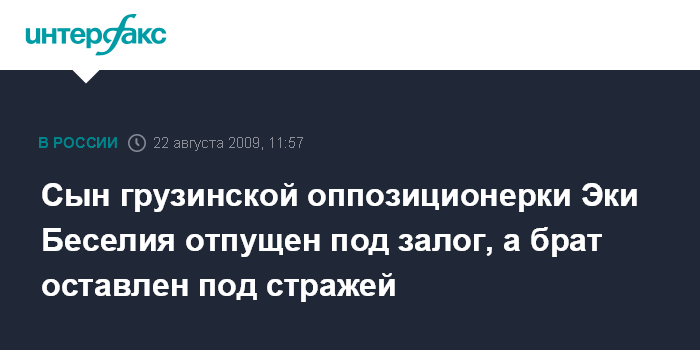 Москва. 22 августа. INTERFAX.RU - Суд города Кобулети освободил под залог Рати Милорава, сына одного из лидеров оппозиции Эки Беселия, а ее брату Серго Беселия придется провести в предварительном заключении два месяца.