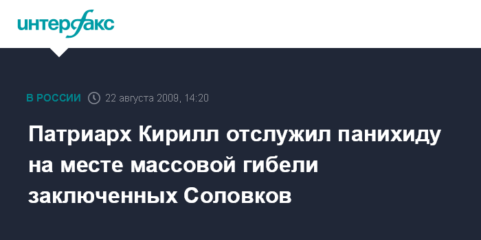 Москва. 22 августа. INTERFAX.RU - Патриарх Московский и всея Руси Кирилл совершил заупокойную литию на месте казни заключенных Соловецкого лагеря и молебен новомученикам, которые пострадали за веру от большевиков.