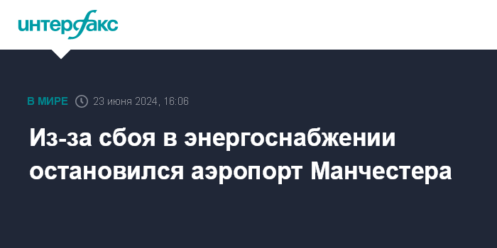 Москва. 23 июня. INTERFAX.RU - Аэропорт Манчестера приостановил работу из-за серьезных перебоев в энергоснабжении, сообщает в воскресенье Sky News.