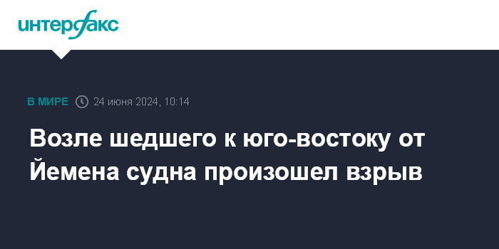 Москва. 24 июня. INTERFAX.RU - Экипаж судна, которое в понедельник двигалось в 445 км к юго-востоку от Ништуна на побережье Йемена, зафиксировал взрыв на близком расстоянии, сообщили в Управлении морских торговых операций Великобритании (UKMTO).