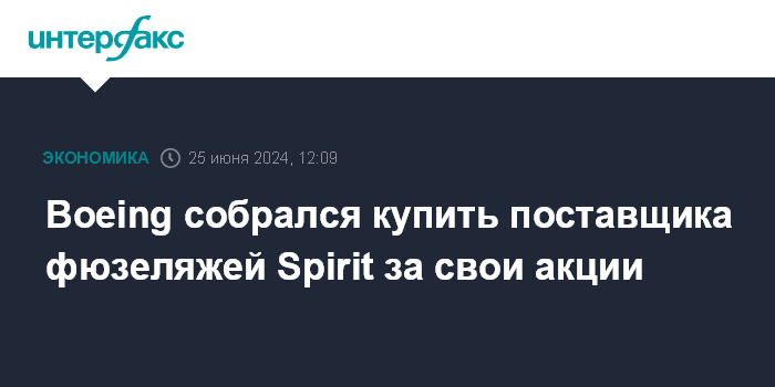 Москва. 25 июня. INTERFAX.RU - Американская Boeing Co. хочет использовать преимущественно акции для покупки своего поставщика Spirit AeroSystems Holdings, пишет The Wall Street Journal со ссылкой на информированные источники.