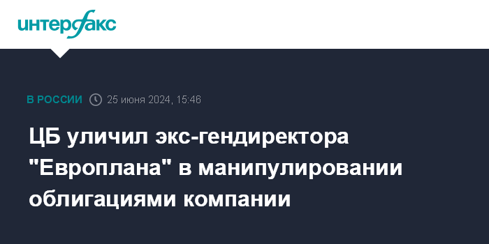 Москва. 25 июня. INTERFAX.RU - Банк России установил факты манипулирования облигациями лизинговой компании "Европлан" весной 2022 года ее бывшими топ-менеджерами.