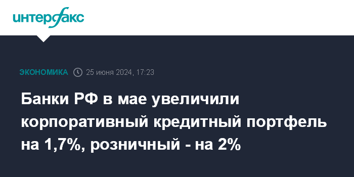 Москва. 25 июня. INTERFAX.RU - Банки РФ в мае увеличили корпоративный кредитный портфель на 1,7% (или на 1,3 трлн рублей) после прироста на 1,9% в апреле и 1,8% в марте, говорится в материале ЦБ РФ о динамике развития банковского сектора.