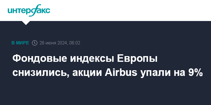 Фондовые индексы Европы снизились, акции Airbus упали на 9%