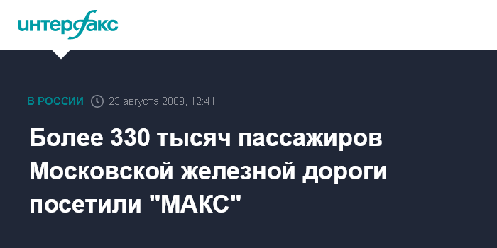 Москва. 23 августа. INTERFAX.RU - За пятницу и субботу авиасалон "МАКС-2009" посетили 337 тыс. пассажиров Московской железной дороги, сообщили "Интерфаксу" в службе по связям с общественностью столичной магистрали в воскресенье.