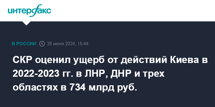 Москва. 26 июня. INTERFAX.RU - Ущерб от действий ВСУ в Донецкой и Луганской народных республиках, а также трех приграничных областях РФ превысил 730 млрд рублей с 2022 года, заявил зампредседателя Следственного комитета РФ Александр Федоров.