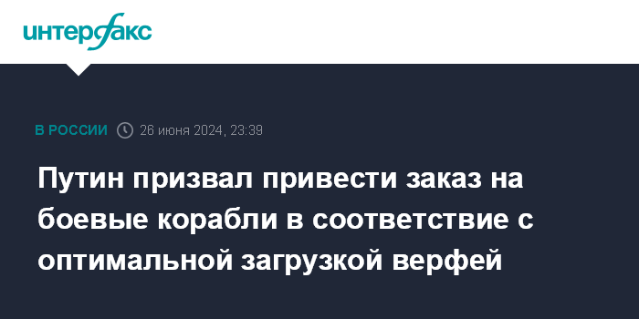 Москва. 26 июня. INTERFAX.RU - Президент РФ Владимир Путин заявил о необходимости соответствия заказов на боевые корабли оптимальной загрузке верфей, отметил, что объемы госфинансирования должны учитывать особенности кооперации в судостроении и ряд других факторов.