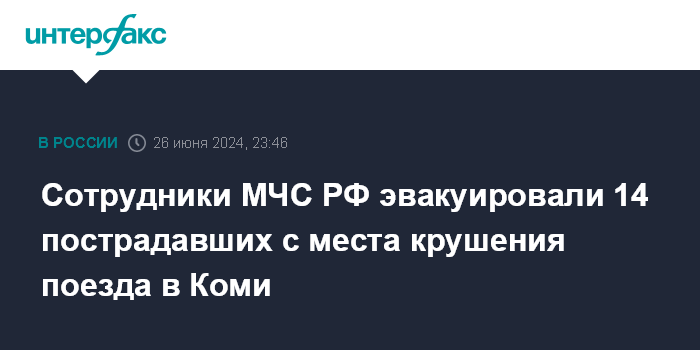 Москва. 26 июня. INTERFAX.RU - При помощи специалистов МЧС России 14 пострадавших при крушении пассажирского поезда в Коми доставлены пожарным поездом на железнодорожную станцию Инты, сообщила пресс-служба министерства в среду.