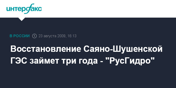 Москва. 23 августа. INTERFAX.RU - Компания "РусГидро" рассчитывает полностью восстановить Саяно-Шушенскую ГЭС за три года.