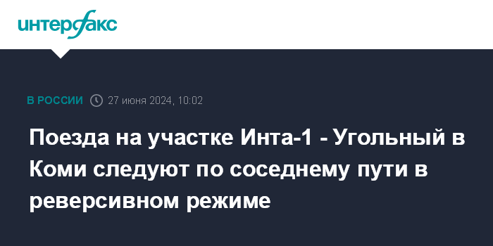 Москва. 27 июня. INTERFAX.RU - Поезда на участке Инта-1 - Угольный Северной железной дороги в настоящее время пропускаются по участку соседнего пути в реверсивном режиме, сообщает ОАО "РЖД".