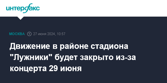 "В связи с проведением концерта в районе стадиона "Лужники" будет закрыто движение для транспорта 29 июня", - говорится в телеграм-канале департамента.