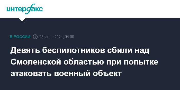 Девять беспилотников сбили над Смоленской областью при попытке атаковать военный объект