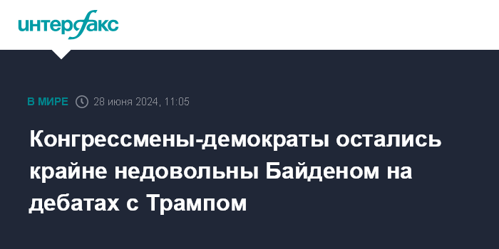 Москва. 28 июня. INTERFAX.RU - Демократы в Конгрессе США очень негативно восприняли выступление президента-демократа Джо Байдена на его первых дебатах с экс-президентом республиканцем Дональдом Трампом, сообщает Axios со ссылкой на пожелавших остаться неназванными конгрессменов.
