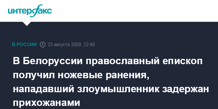 Минск. 23 августа. ИНТЕРФАКС - В воскресенье в кафедральном cоборе во имя Трех святителей в белорусском городе Могилёве совершено нападение на епископа Могилевского и Мстиславского Софрония, в результате которого архипастырь получил ножевые ранения.