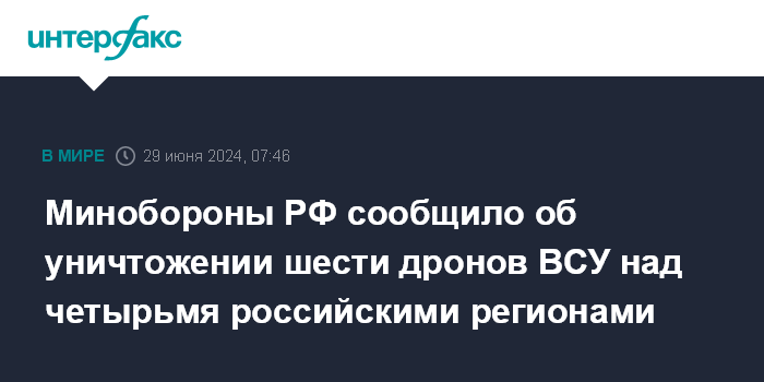 Москва. 29 июня. INTERFAX.RU - Силы противовоздушной обороны (ПВО) сбили за минувшую ночь шесть украинских беспилотников над четырьмя регионами РФ, в том числе два дрона уничтожено над Крымом, сообщило российское Минобороны в субботу утром.