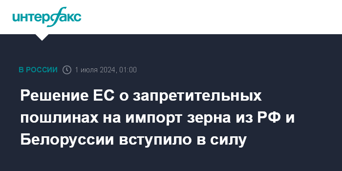 Москва. 1 июля. INTERFAX.RU - Решение Совета ЕС о повышении таможенных пошлин на импорт российской и белорусской зерновой продукции в Евросоюз вступило в силу.