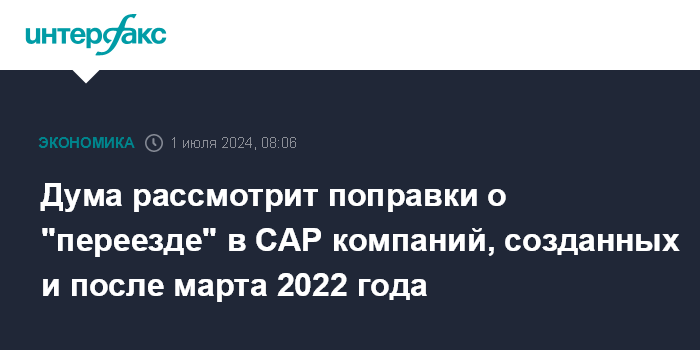 Москва. 1 июля. INTERFAX.RU - "Переезд" в российские специальные административные районы (САР) станет доступен для более "молодых" компаний - созданных до 1 марта 2024 года, а не до 1 марта 2022 года, как предусмотрено сейчас, говорится в подготовленных ко второму чтению поправках к закону "О международных компаниях и международных фондах".