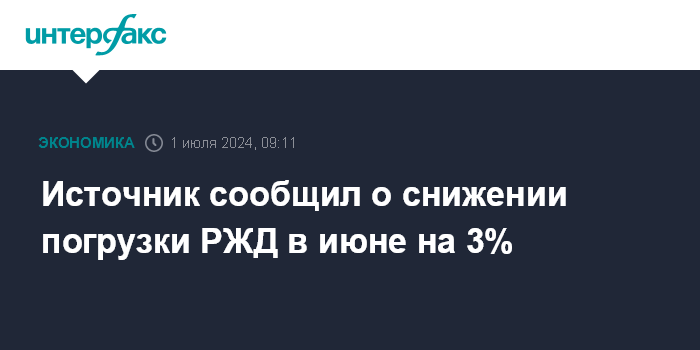 Москва. 1 июля. INTERFAX.RU - В июне 2024 года среднесуточная погрузка на сети ОАО "РЖД" снизилась на 3% в годовом исчислении, до 3278 тысяч тонн, сообщил "Интерфаксу" источник, знакомый с деятельностью компании.