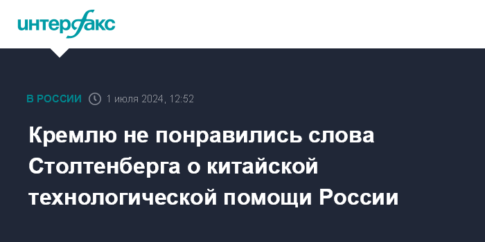 Москва. 1 июля. INTERFAX.RU - Кремль негативно относится к заявлению генсека НАТО Йенса Столтенберга о том, что Китай провоцирует конфликт в Европе, помогая России современными технологиями и электроникой.