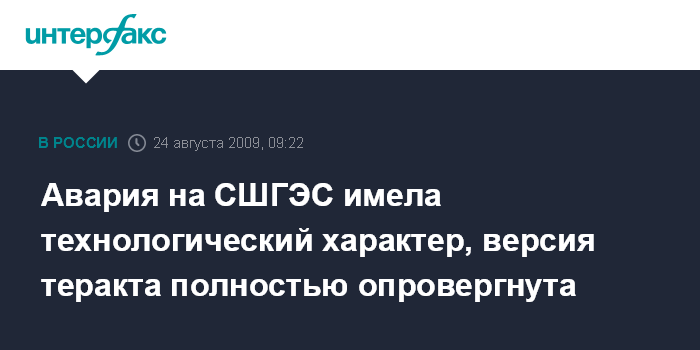 Москва. 24 августа. INTERFAX.RU - В Следственном комитете при прокуратуре РФ заявили о технологическом характере аварии на Саяно-Шушенской ГЭС.
