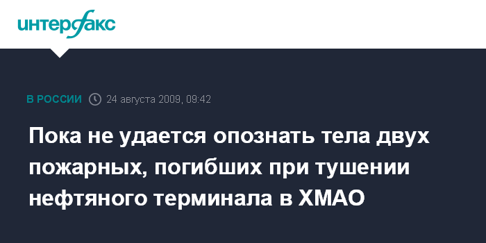 Москва. 24 августа. INTERFAX.RU - Тела двух пожарных, погибших при тушении горящего в Ханты-Мансийском автономном округе нефтяного терминала, до сих пор не опознаны.