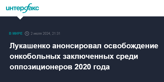Москва. 2 июля. INTERFAX.RU - Президент Белоруссии Александр Лукашенко заявил о предстоящем освобождении онкобольных заключенных, осужденных за беспорядки в 2020 году.
