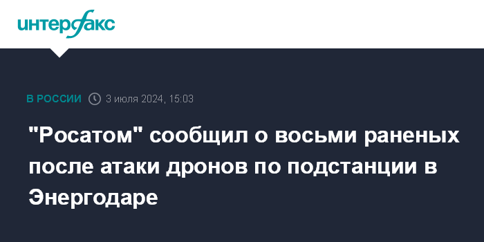 Москва. 3 июля. INTERFAX.RU - Глава "Росатома" Алексей Лихачев сообщил, что в результате трех ударов дронов по по подстанции "Радуга" в Энергодаре пострадали восемь сотрудников Запорожской АЭС, и назвал это компрометацией принципа безопасности МАГАТЭ.