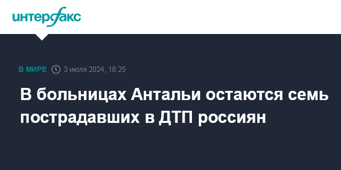 Москва. 3 июля. INTERFAX.RU - В больницах турецкой Антальи остаются семь российских туристов, пострадавших в ДТП с автобусом, один получил тяжелые травмы, сообщает Генконсульство России в провинции Анталья.