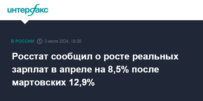 Росстат сообщил о росте реальных зарплат в апреле на 8,5% после мартовских 12,9%