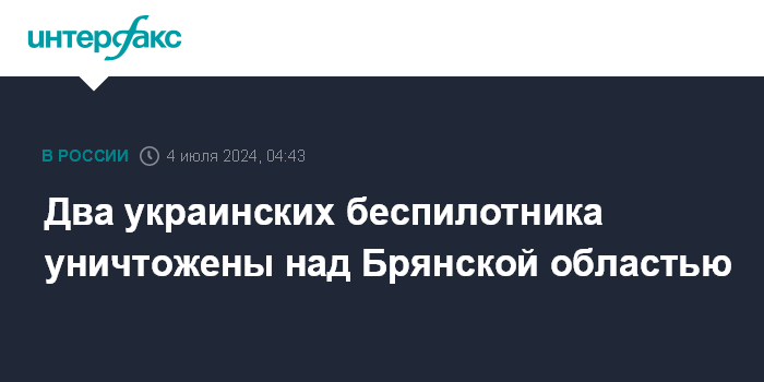Москва. 4 июля. INTERFAX.RU - Два БПЛА ВСУ сбиты над Брянской областью, сообщил глава региона Александр Богомаз.