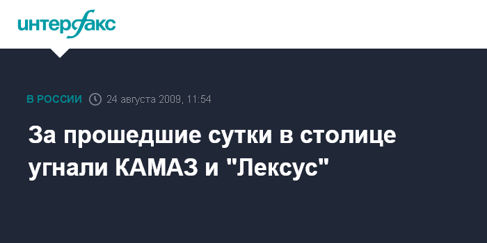 Москва. 24 августа. INTERFAX.RU - За прошедшие сутки в Москве угнали КАМАЗ и "Лексус" общей стоимостью около 4,5 млн рублей, сообщил "Интерфаксу" источник в правоохранительных органах города в понедельник.
