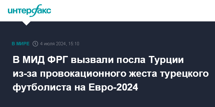 Москва. 4 июля. INTERFAX.RU - В МИД Германии сообщили, что вызвали посла Турции из-за вызвавшего полемику жеста, показанного турецким защитником Мерихом Демиралом во время недавнего матча чемпионата Европы по футболу.