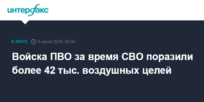 Москва. 5 июля. INTERFAX.RU - Российские средства ПВО с начала специальной военной операции (СВО) на Украине уничтожили более 42 тыс. воздушных целей, заявил командующий войсками противовоздушной и противоракетной обороны - заместитель главкома Воздушно-космическими силами РФ Андрей Семенов.