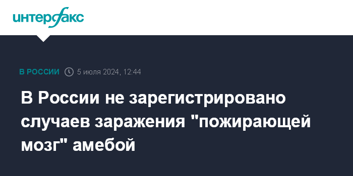 Москва. 5 июля. INTERFAX.RU - Случаи заражения амебой, о заражении которой сообщали в Израиле, в России не регистрировались, в водоемах РФ она не обитает, сообщили в Роспотребнадзоре.