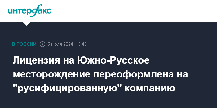 Лицензия на Южно-Русское месторождение переоформлена на "русифицированную" компанию