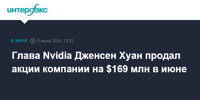 Москва. 5 июля. INTERFAX.RU - Главный исполнительный директор американского чипмейкера Nvidia Corp. Дженсен Хуан продал 1,3 млн акций компании на общую сумму почти $169 млн в июне, пишет MarketWatch.