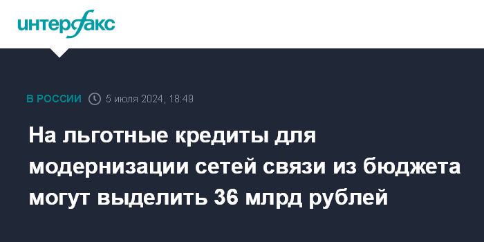 Москва. 5 июля. INTERFAX.RU - В России могут ввести льготное кредитование операторов связи на модернизацию сетей передачи данных и инфраструктуры доступа, а также строительство сетей 5G может, на это из федерального бюджета планируется выделить в 2025-2030 годах 36 млрд рублей.
