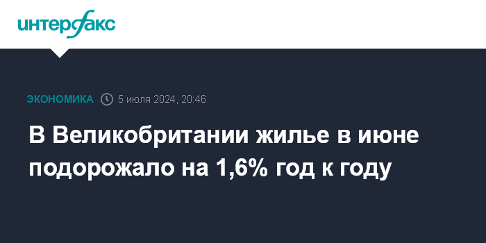 Москва. 5 июля. INTERFAX.RU - В июне 2024 года цены на британскую жилую недвижимость в июне увеличились на 1,6% в годовом выражении, сообщила консалтинговая компания Halifax.