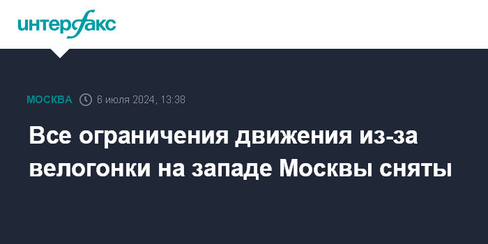 Москва. 6 июля. INTERFAX.RU - Все временные ограничения, введенные на ряде улиц в Западном административном округе в связи с проведением велогонки "Столица", сняты, сообщили в субботу в столичном департаменте транспорта.