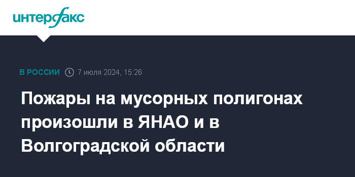 Москва. 7 июля. INTERFAX.RU - Полигоны твердых бытовых отходов загорелись в городе Надым Ямало-Ненецкого автономного округа и в городе Михайловка Волгоградской области.