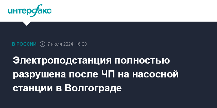 Москва. 7 июля. INTERFAX.RU - Обеспечивающая электричеством подстанция при насосной станции в Волгограде полностью разрушена после взрыва, при этом вода подается в полном объеме потребителям, сообщил губернатор Волгоградской области Андрей Бочаров в ходе оперативного совещания.