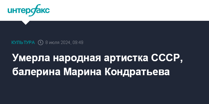 Москва. 8 июля. INTERFAX.RU - Народная артистка СССР, прима-балерина Государственного академического Большого театра (ГАБТ) России Марина Кондратьева скончалась на 91-м году жизни, сообщили в пресс-службе Большого театра.